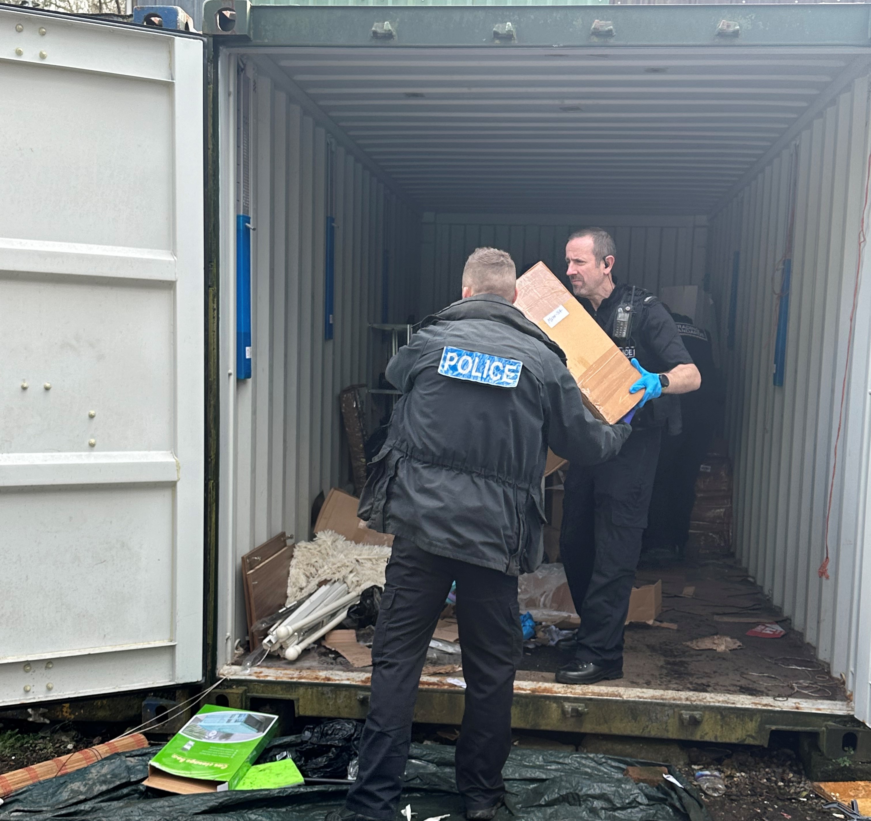 Photo: Police Officers assisting Trading Standards to seize the suspected illegal items