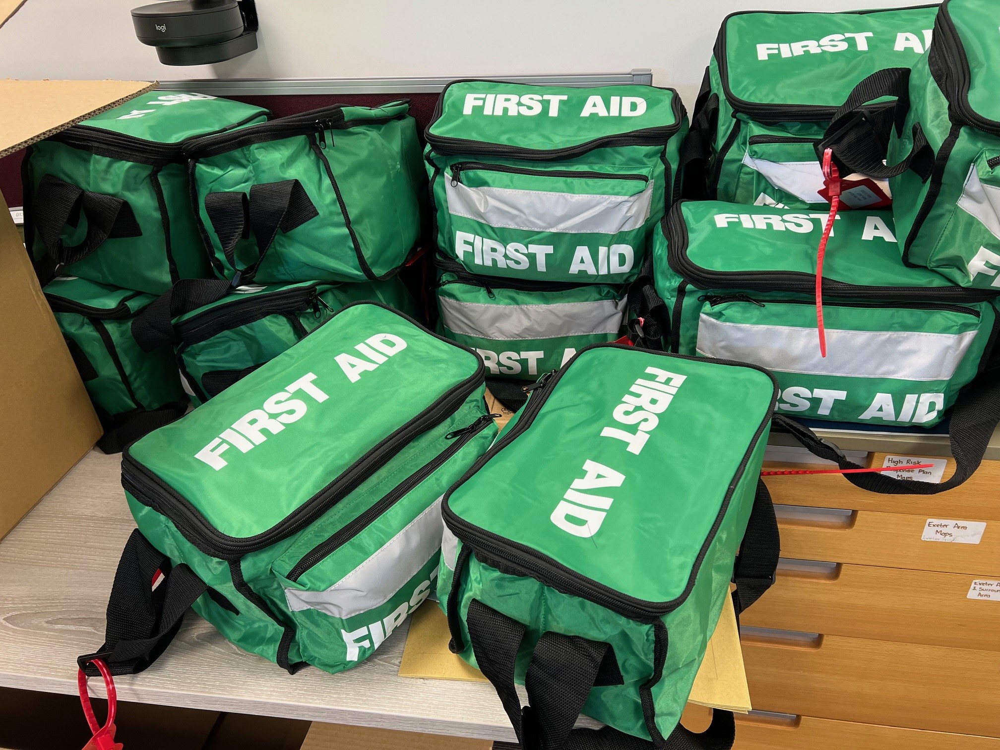 (Pictured: Ten Second Triage wristbands and "pebble" kit containing nasal Naloxone, First Aid bags awaiting collection)