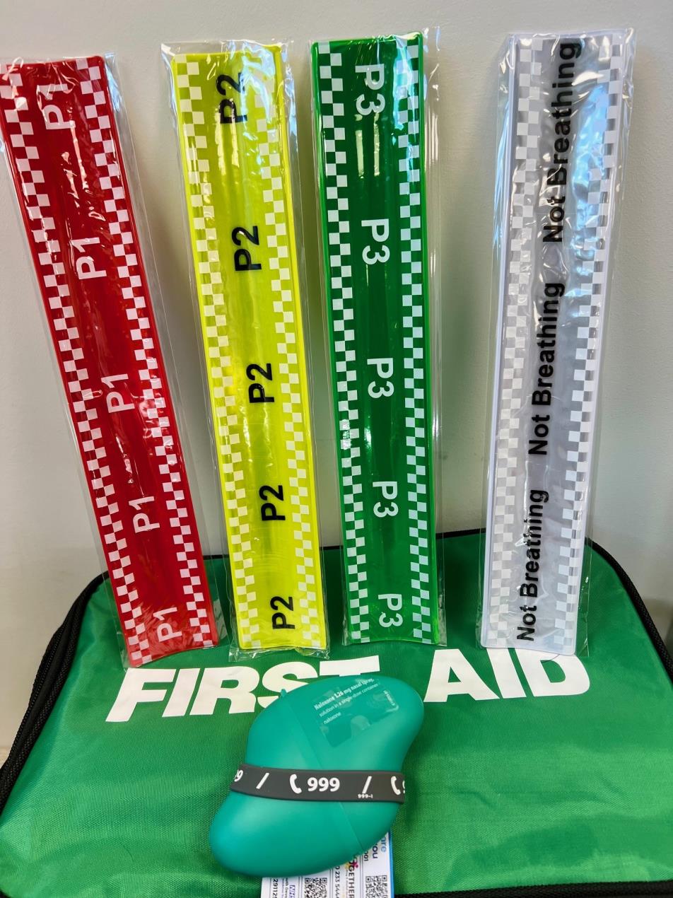 The new First Aid kits will also contain the Ten Second Triage system, developed using learning from the Manchester Arena bombing. Police response officers or ARV (Armed Response Vehicle) crews are often first on the scene of major traumatic incidents. The kit contains a selection of colour coded wrist snap bands that officers can quickly attach to victims so that when medics arrive on the scene they can prioritise the most urgent cases. The wristbands are of the type which are often used as promotional or reflective high visibility road safety items.